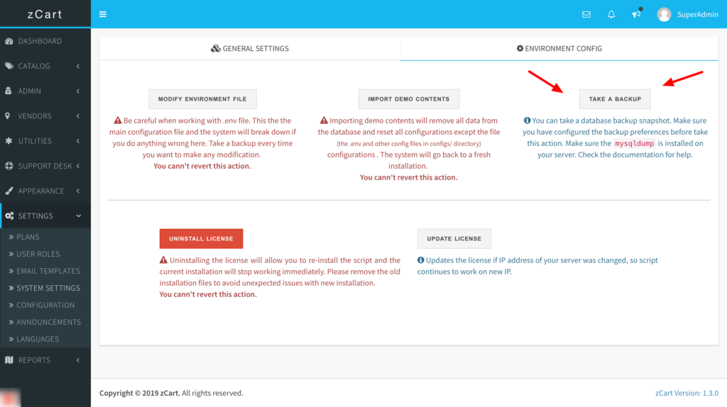 To configure backup, the first thing is to make sure you have configured the backup preferences before taking this action. Make sure the mysqldump is installed and enabled on your server. After that open the .env file and update these keys with your preferred values.