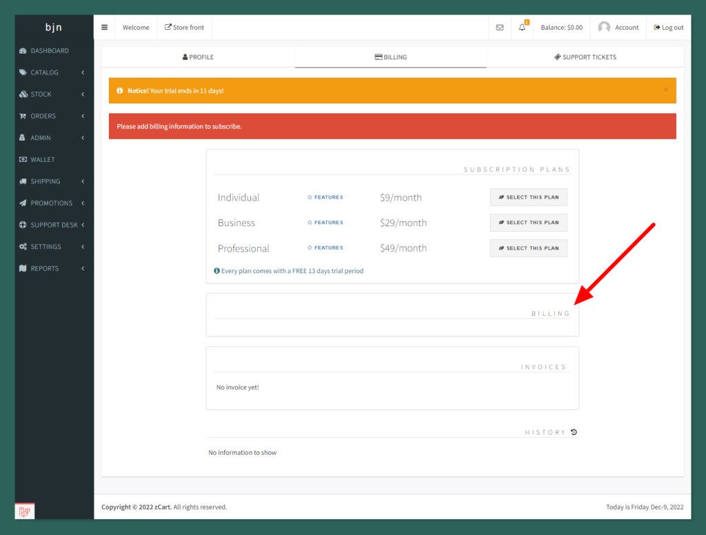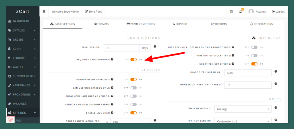 You can turn on the ” REQUIRED CARD UPFRONT” button from the admin dashboard. If you enable this then your sellers need to give input card information first before starting the trial period otherwise he/she won’t get the seller dashboard access.