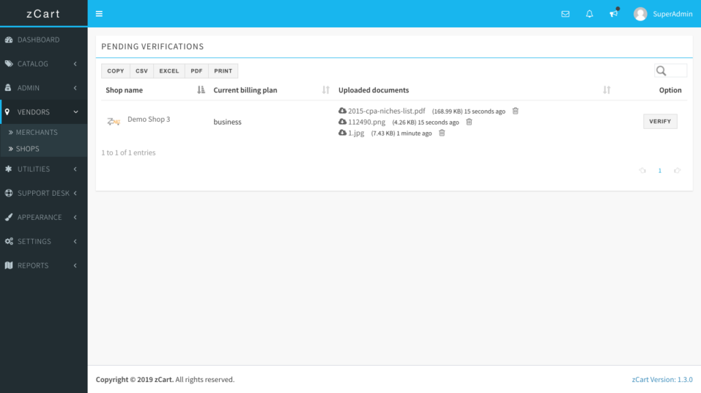 When a vendor uploads documents to verify you’ll see the PENDING VERIFICATIONS box with the number of requests.