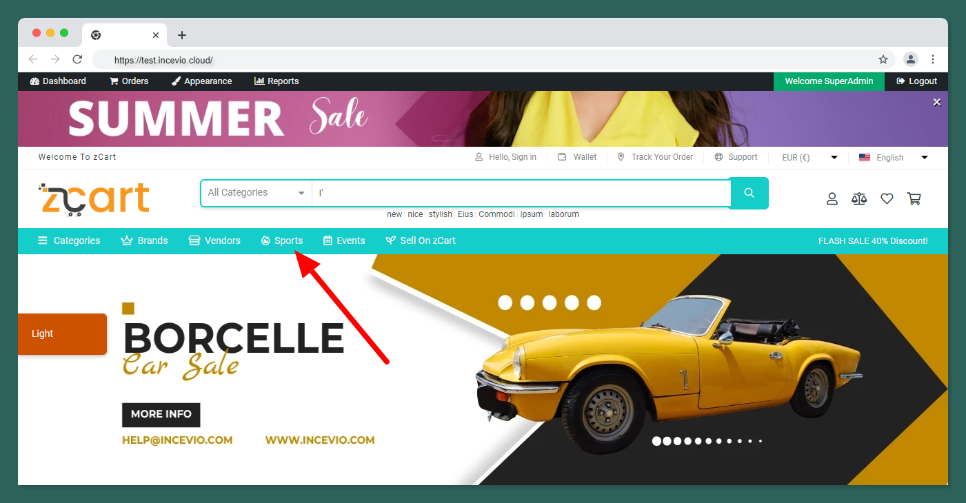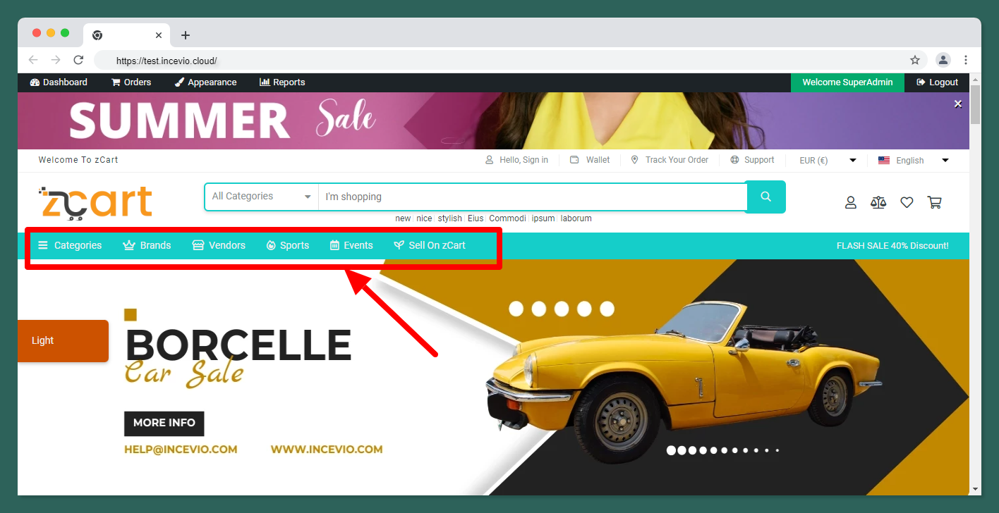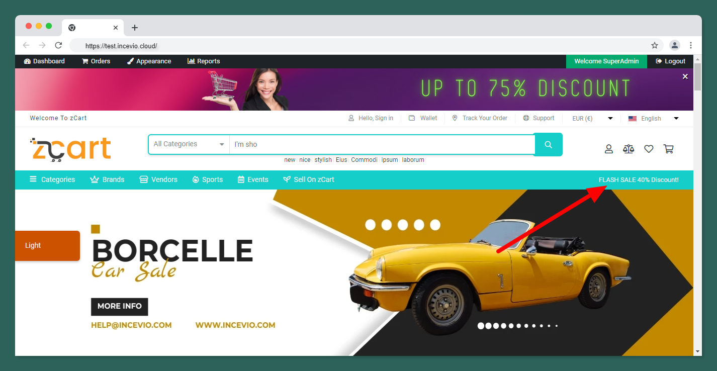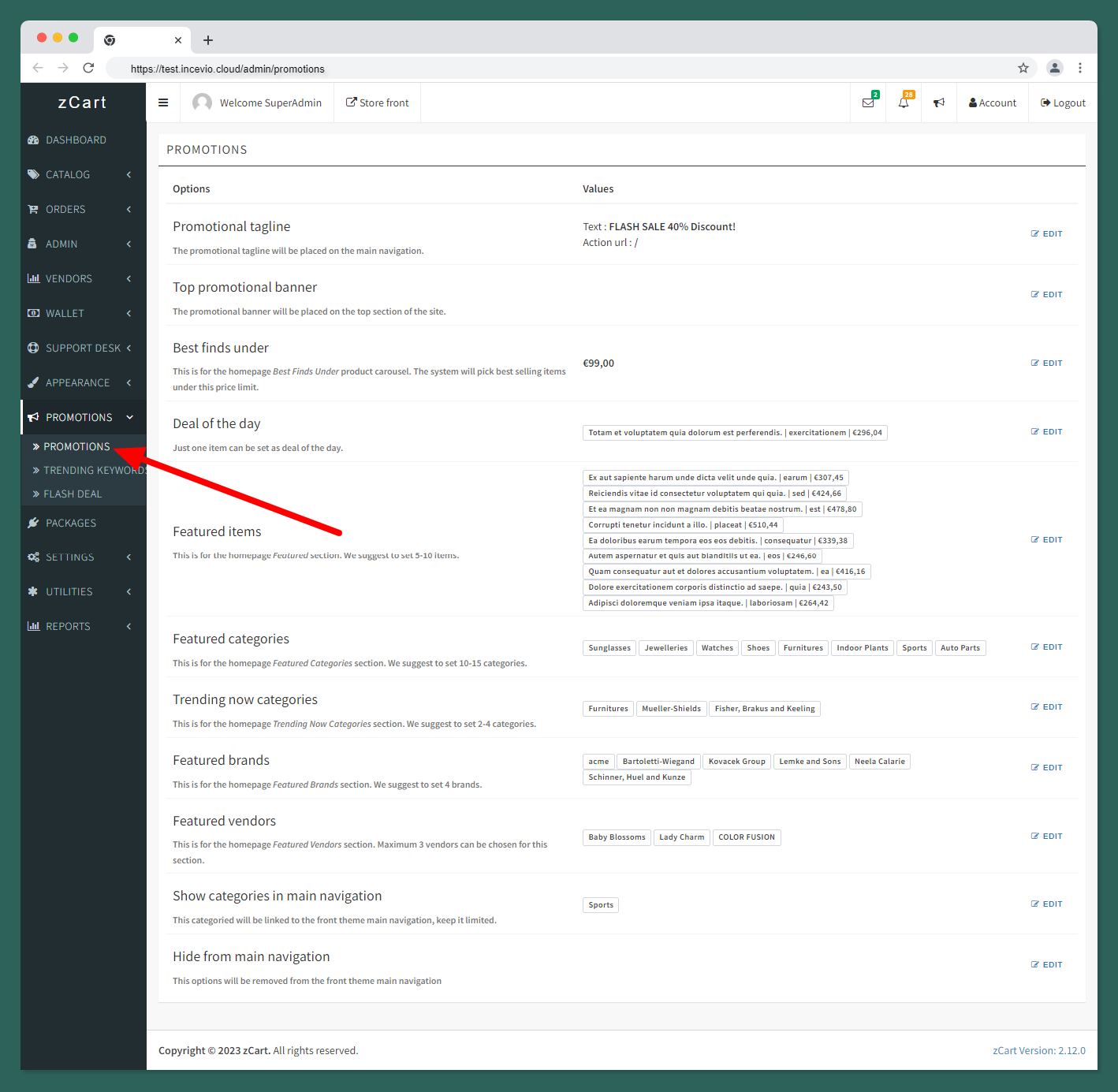 zCart has various promotional features to make the marketplace more engaging and boost sales. Like admin can set the Promotional Tagline, Top promotional banner, Best Finds Under, Deal of the day, Featured categories, Featured items, Featured vendors, Featured brands, Trending now categories. add categories in main navigation and can hide menu from main navigation from the Promotion page.