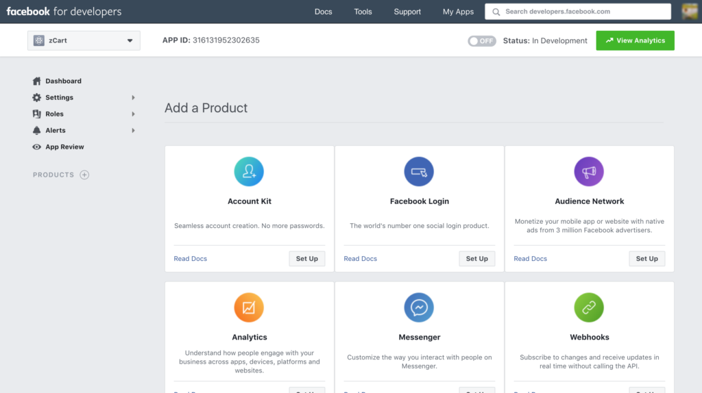 To configure Facebook login, go to the Facebook Developer site and create an app for your marketplace. Now login into your developer account Dashboard. From the list of products select Facebook Login and click the Set Up button.
