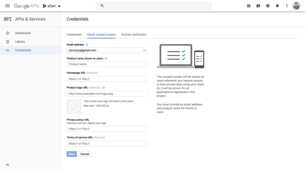 Now go to the Credentials in the sidebar. Click OAuth consent screen tab and fill out the details there.