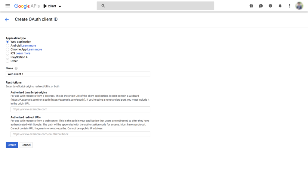 In the OAuth client ID screen, select the type of application, give origin and callback URLs like https://your_domain/socialite/customer/google/callback