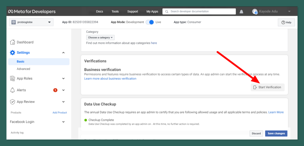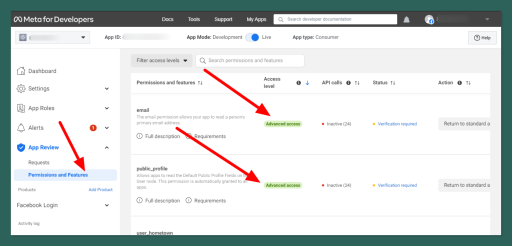 Then go to the App Reviews > Permissions & Features and make sure “email” & “public_profile” have active advanced-level access. Verification is required to activate this.
