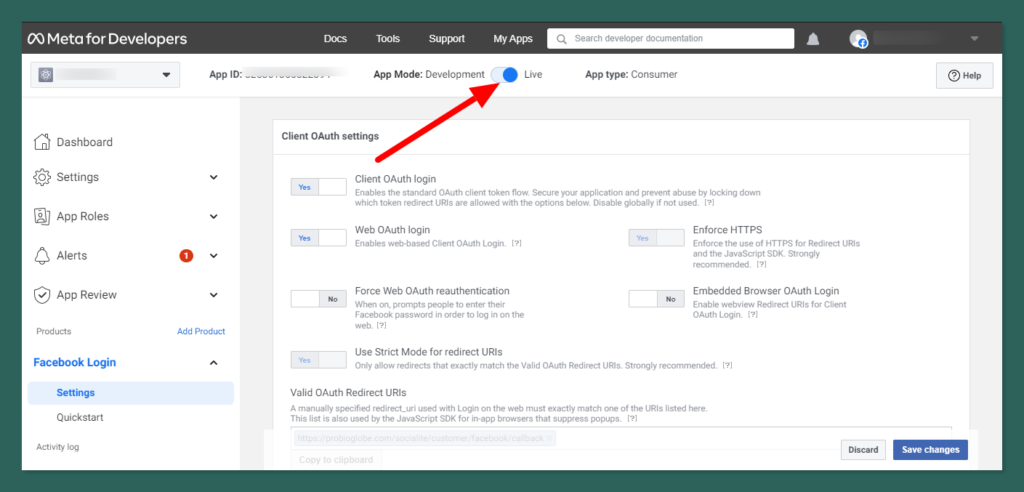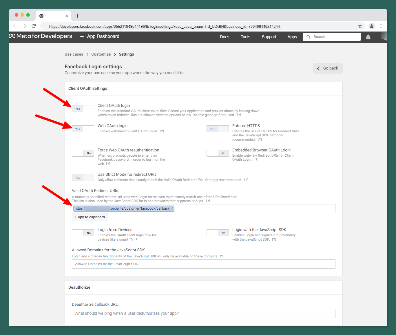 Enable Client OAuth Login and Web OAuth Login. After that give the callback URL like https://your_domain/socialite/customer/facebook/callback on the Valid OAuth Redirect URIs input field. Customers will be redirected to this URL after authentication. You can ignore the rest of the settings and click Save Changes.