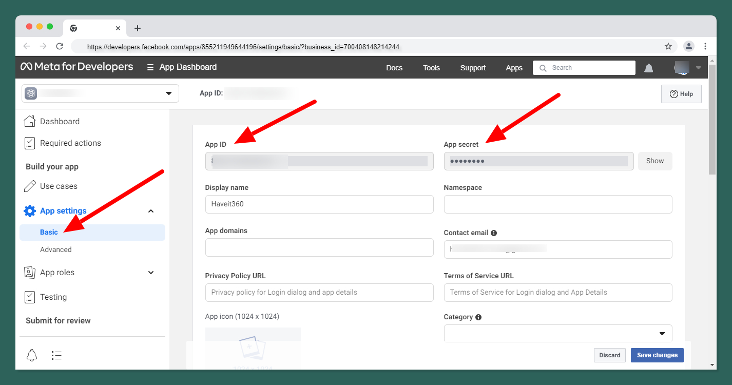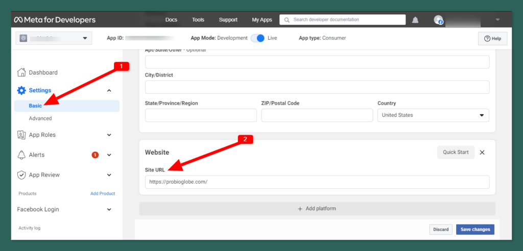 Go to the Settings > Basic sidebar. All the API credentials you need are here, get the App ID and App Secret. Fill out the form with your marketplace information and Save Changes. Below the same screen select Web and then on the coming screen just give the Site URL and click Save.