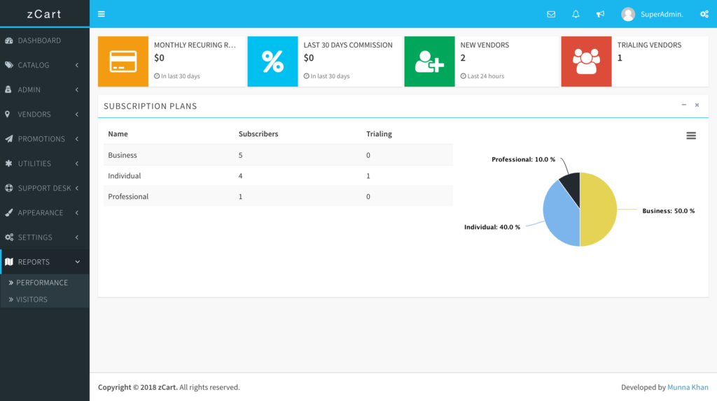 The key performance indicator will show you how many vendors are currently registered and how many of them are paying. You can see the number of trialing subscriptions, recurring vendors and more.