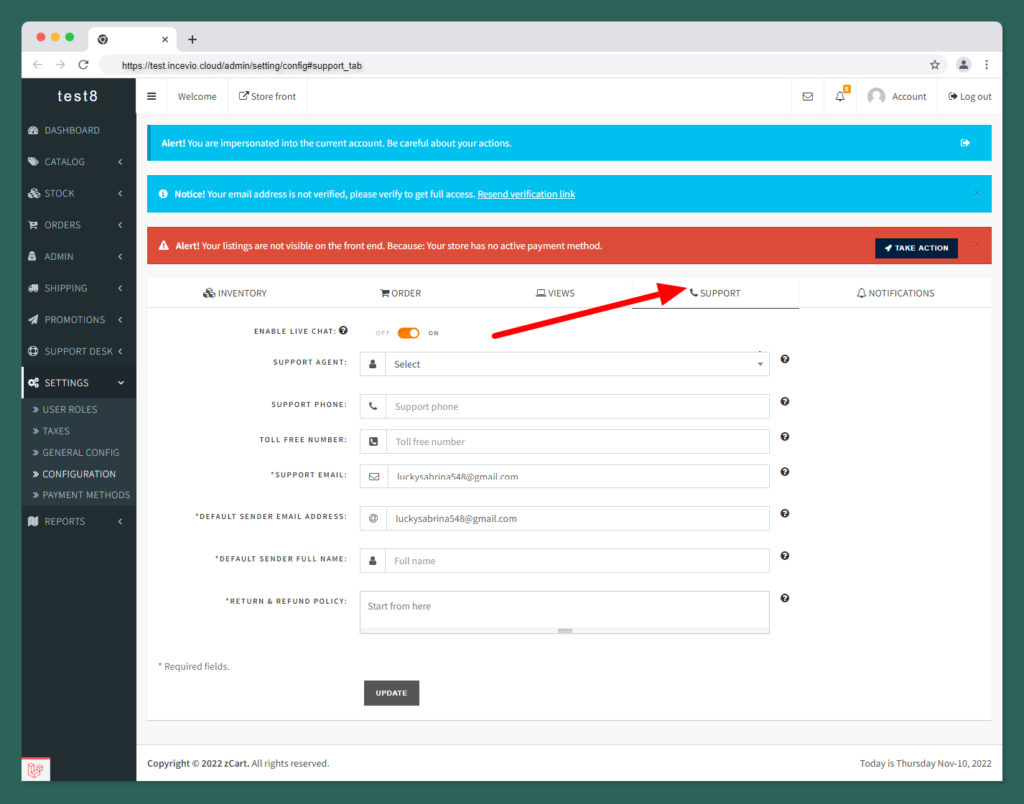 Step 5: You can enable/disable the live chat option for your shoppers from here. Also, you can set the support email, phone number, etc for your customers here.