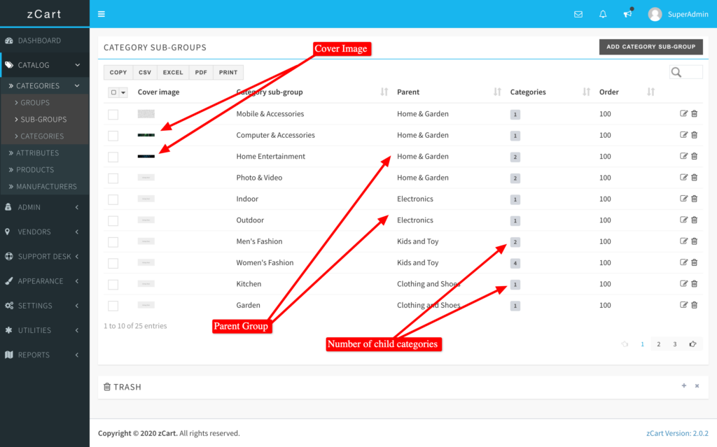 The category module is divided into three sub-modules like group, sub-group, and category. Category group is the grandparent and the first step to organizing the product listings, under a category group there can be many sub-groups and finally, a sub-group can hold many categories.