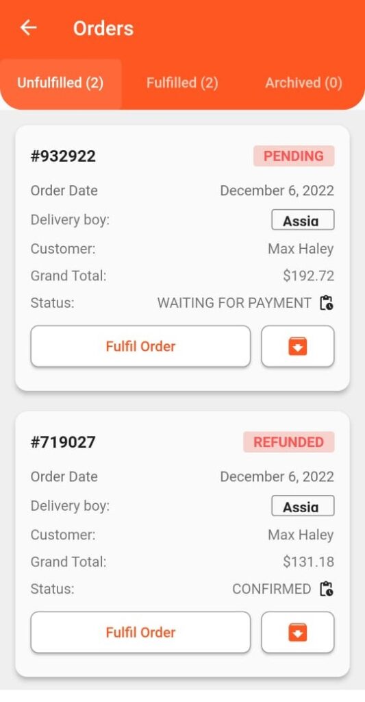 Now merchants can manage their orders from the app within a short moment. They are able to change the order status too. Like unfulfilled to fulfilled/ fulfilled to archive etc.