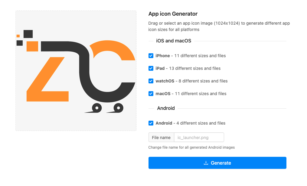 - Generate icons. [Select all platforms, as this is the same method for iOS as well].