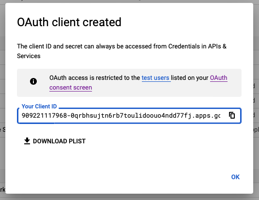 • After creating the iOS client, it will show you a popup. From here, copy the client ID and download the PLIST file.