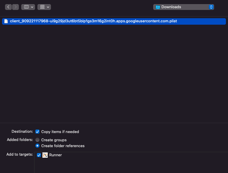 • Select the downloaded PLIST file and check “Copy items if needed” and Add to targets “Runner”. Then Click ADD to add this file in the Xcode. Close Xcode and open VS code or Android studio to see the file is in the iOS file or not.