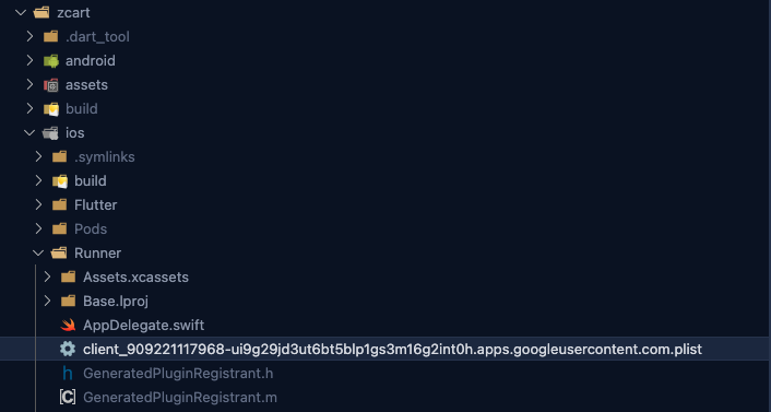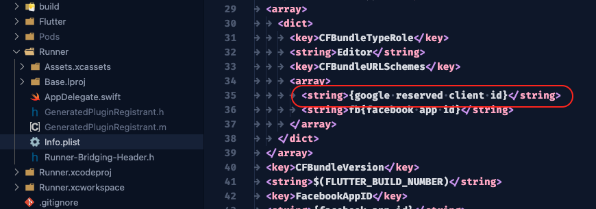 • Now you need to add the client ID you copied before in the info.plist file. So open info.plist file which is located in the same directory, ios/Runner/info.plist. Replace {google reserved client id} with your client ID.