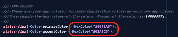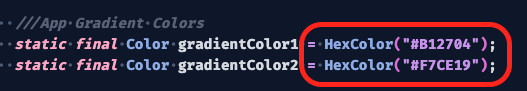 These two colors are the base colors of your app. You can use color codes like #CF45B8. Change the colors inside HexColor for both of them.