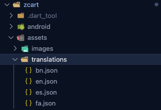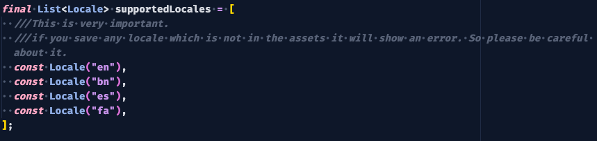 After saving the file here in the assets folder. Open the file named supported_locales.dart which is located in lib\translations\supported_locales.dart.