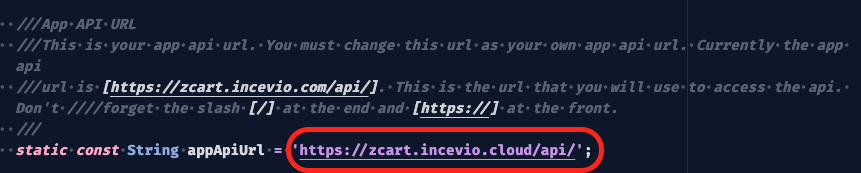 In the same file above (zcart_delivery/lib/config/config.dart), you will find a constant variable named ‘appApiUrl’. Change this as your API url.